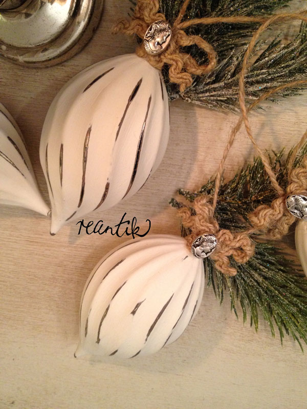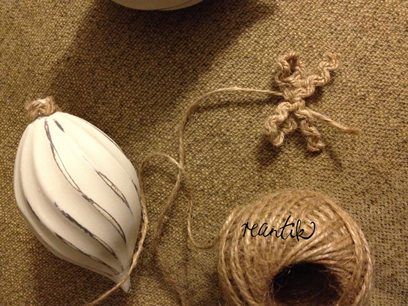 Mivel bespájzoltam a krétafestékből, és az adott volt, ráadásul szeretem is használni, ezt a fenyődíszt is azzal festettem le. Egy rétegben shades árnyalat, arra pedig old white árnyalat került