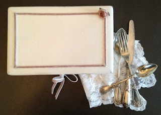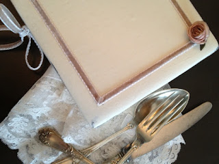 A dobozka alsó rekeszébe, a vászon alá még egy darabka filc anyagot is méretre vágtam és beragasztottam, hogy puhább legyen (no nem mintha panaszkodnának majd az evőeszközök, de ha már nem maradt meg az aprócska fából készült tartójuk, akkor legalább ez járt nekik).
