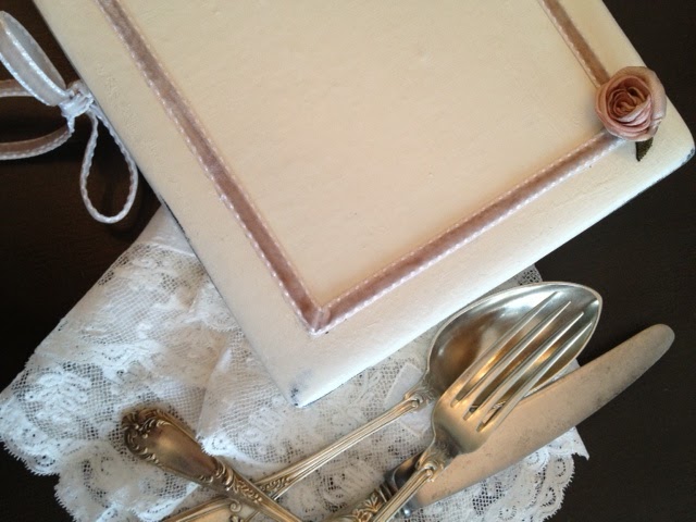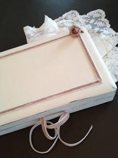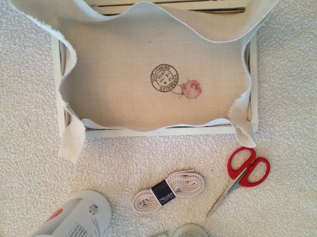 Amikor ez készen lett, ragasztópisztollyal körben a tetejére ragasztottam a szürkés-drappos-rózsaszínes szépséges bársonyszalagból, amelyet a sarkoknál varrással – gérbe-vágás – szerűen rögzítettem is.