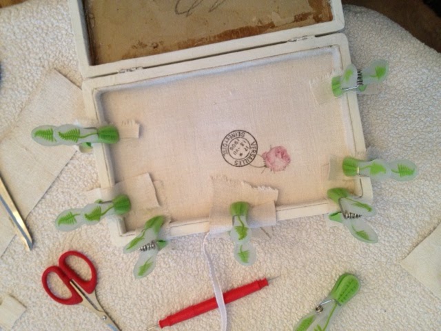A doboz tető-részének belsejébe mindenképpen szerettem volna valami szép mintát, a hímzés most szóba sem jöhetett, hiszen sok időbe telt volna – és most türelmetlen voltam, mert azt akartam, hogy minél hamarabb befejezzem – de egy egyszerű, transzferált minta is remekül mutat az antik vásznon.