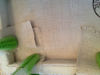 A karton függőleges részeire beszabtam és visszahajtottam a vásznat, amit ráadásként a sarkokon tűzőgéppel is rögzítettem, majd alul és körben beragasztottam a barkácsragasztóval.