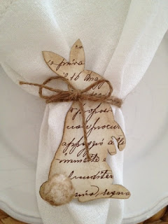 Végezetül átkötöztem a hófehér lenvászon szalvétáimat egy darabka spárgával úgy, hogy közben odafogtam a nyuszit, így a masni éppen a nyakára került.