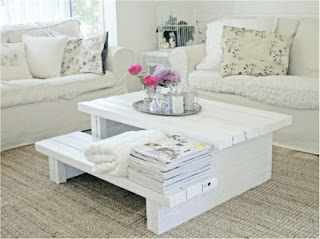 nappaliba kisasztalként hatalmas görgőkkel, fehérre festve,