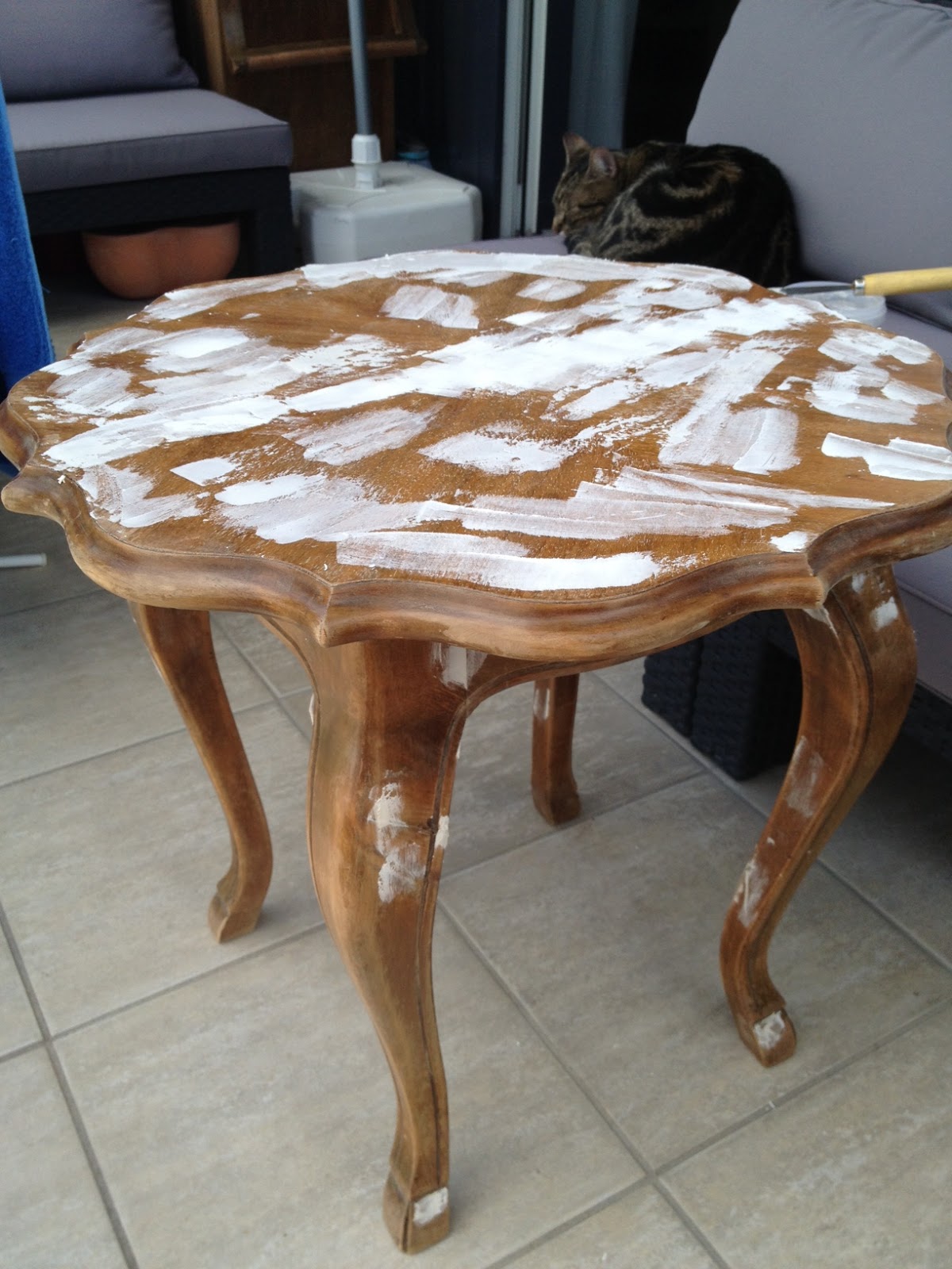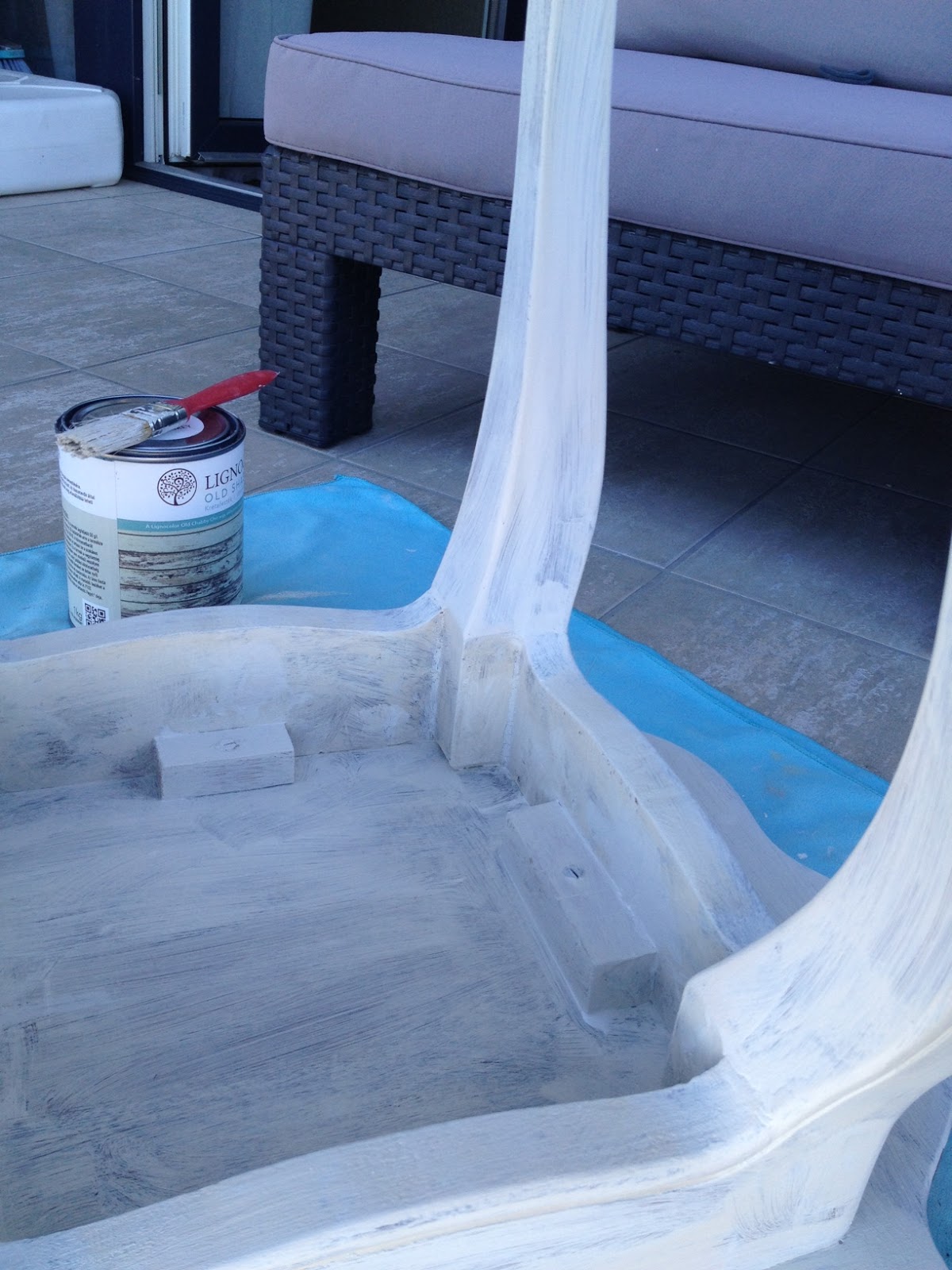 Addig bőven volt időm a vázat alaposan rendbehozni és más projektekre is. A mozgó részeket – mint pl. a háttámla esztergált babáit – ragasztottam, majd a réseket óvatosan fatapaszoltam. A Lignocolor light grey árnyalatú krétafestékével festettem le, visszacsiszolással koptattam a festékrétegből, hogy még jobban érvényesüljön a minta, majd az egészet átkentem áttetsző wax-al, és megérdemelt még egy alapos puha rongyos bedörzsölést is.