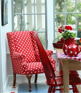 A dédi régi fülesfoteljéhez pedig nincs is jobb választás a pöttyös bútorszövetnél.