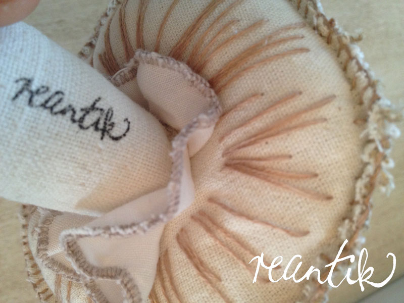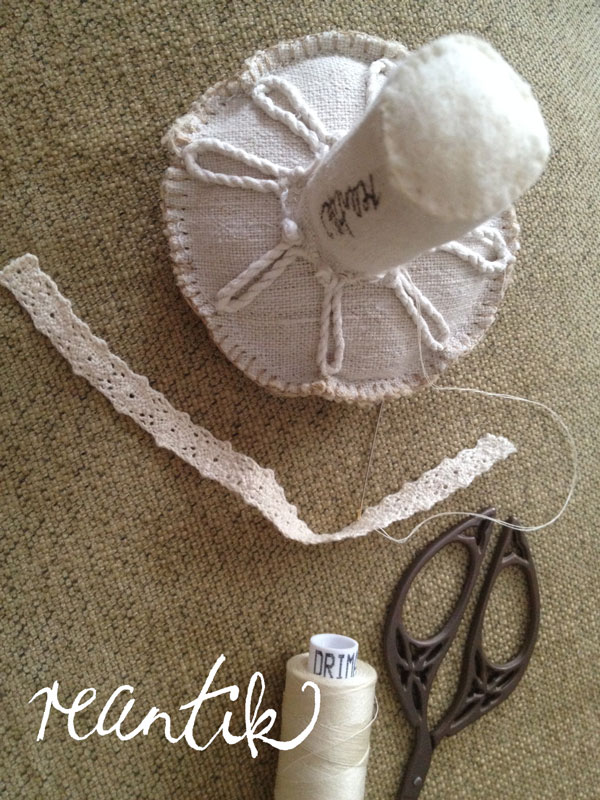 Az utolsó réteget is a kezdőhöz hasonlóan alakítottam ki, de itt betűztem még két picurka levelet is szárastul, és két csillámos műanyag levélkét is. A végére ragasztottam egy ezüstös kupakot, a gombostűket eltávolítottam, és csak itt-ott tűztem vissza néhányat egy-egy csiszolt üveggyönggyel kiegészítve, a csillogás kedvéért. Már csak egy gyűrt selyemszalag kellett és kész is. Egy szép karácsonyi szalaggal pedig akár már finoman hangolódhatunk az elkövetkezendő ünnepre is. Avec amour pour Noel – Szeretettel karácsonyra