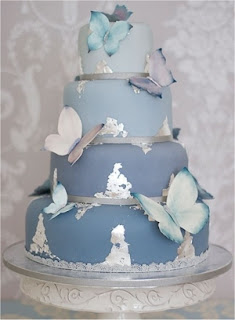 kék torta is lehet ehető cukorpillangókkal, az ombre hatást a szintek emelik ki