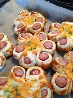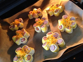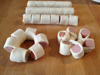 A tésztát 8 egyenlő részre vágtam. Fontos, hogy a virsli a végéig be legyen bugyolálva, és a tészta egymásra is hajtható legyen, hogy ne essen majd szét sütés közben. Minden virslit begöngyöltem, majd 6 egyenlő részre osztva bevagdostam, de a tésztát nem vágtam át teljesen. Karikába hajtottam és a virslidarabokat megfordítottam, hogy a vágott felülete legyen alul és fölül, befejezésül a két végét kereszteztem egymáson.