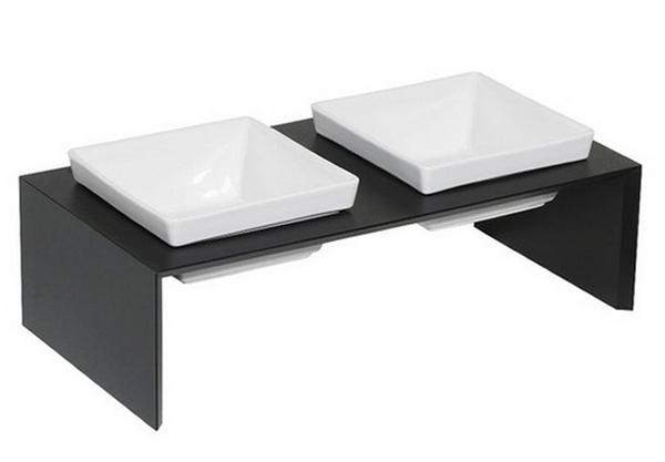 Mini kutya-étkezőasztal süllyesztett tálacskákkal.