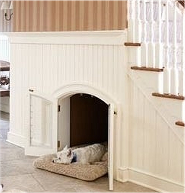 Lépcső alatti hely kihasználása egy remek példa. Zárható rácsos ajtó szolgálja a kutyus elszeparálását, persze csak szükség esetén.