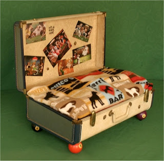 A neten sok – ehhez hasonló – régi bőröndöt újrahasznosító kutyafekhely fotót találhatsz, de nekem ez a biliárd golyó lábai miatt tetszett meg.