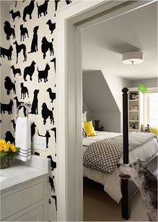 Fehér alapon fekete kutya-sziluett mintás tapéta igazi megszállottaknak. De nem is rossz!