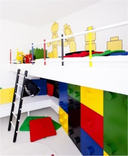Ez a két kép egy szuper gyerekszobában készült, a színes elemek az emeletes ágy alatt a tárolóbútorok fiók- és ajtólapjai, és mivel a fal mellé helyeztek minden funkciót, a szoba maradéktalanul átadható az önfeledt építésnek.