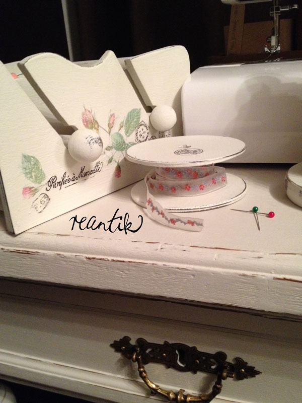 Orsi kezei közül csodaszép tárgyak kerülnek ki, épp az ő oldalát nézegettem, amikor rábukkantam egy szuper-fantasztikus szalagtárolóra. Sok-sok szalagom van, no nem azért mert gyűjtöm őket, nálam ezek felhasználásra kerülnek. Azonban az évek alatt tetemes mennyiségű tekercsem lett. Vannak olyanok is, amelyeket nem tekertek rá semmiféle tartóra, hanem csak úgy géppel szép kis korongokat tekerintettek belőlük, de az ide-oda pakolászás során nekem ezek valahogy nem maradtak abban az állapotban. Arról nem is beszélek, amiből csak pár métert vettem. Így nekem az a kis szerkezet maga volt a menyország. Várni kellett rá, az igaz – de megérte. Nagyon csodálom Orsi alkotásait, de arra gondoltam, hogy az asztal színével megegyezőre festem ezt a kis szerkezetet, így csak úgy csupaszon kértem tőle.